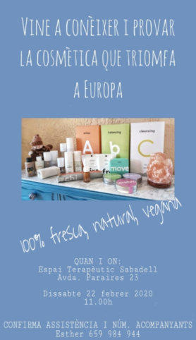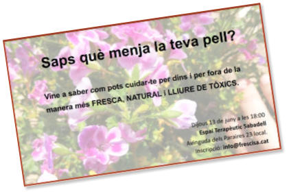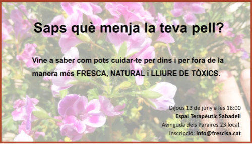 Sabem què menja la nostra pell? Vine a conèixer i provar l'alternativa en cosmètica que triomfa a Europa:•100% Bio•100% Frescos•100% Vegans•100% lliure de tòxicsEl proper 29 de març a les 19:00 us convido a la meva xerrada que tindrà lloc a:Associació de Veïns i Veïnes Can Font - Can AvellanedaCarrer Ntra. Sra. de la Salut 2 08211, Castellar del Vallés, BarcelonaPonents: Esther Zaballa Sílvia Rodríguezapunta’t-hi enviant-me un correu ainfo@frescisa.cat